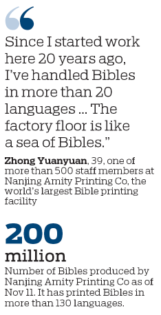 She is just one of more than 500 staff members employed by Nanjing Amity Printing Co, for which printing Bibles has become a specialty. It took the company 25 years to print the first 100 million and just seven years for the next 100 million.