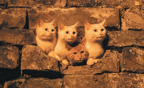 That November he spent a considerable time accompanied by friendly daytime light walking on and along one of the city's most popular tourist sites, Nanjing City Wall, built during the Ming Dynasty (1368-1644).However, it was not until about sunset that Wu finally got his break. Not far away he glimpsed the heads of three little white cats and an orange tabby cat protruding from a recess in the wall. Wu squatted, steadied himself and managed to picture the cats, just above eye level, as they basked in the glow of the setting sun.
