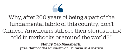 At the exhibition's opening, Yao Maasbach, MOCA's incumbent president, said: "Why, after 200 years of being a part of the fundamental fabric of this country, don't Chinese Americans still see their stories being told in textbooks or around the world? It's not our fault, but we need to do the job. And we want to do it in a way that helps to educate people.