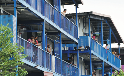 It is estimated that some 50,000 workers are under quarantine. The largest dormitory, Sungei Tengah Lodge, comprises 10 residential blocks and can house up to 25,000 workers.