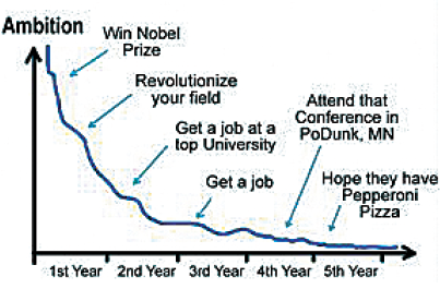 The two variables shown on it are the time and the scale of a person's ambition. The x-axis begins at the point when he or she embarks on the journey to gain a PhD. Here self-expectation is at its zenith, with possibilities almost boundless, a Nobel Prize being one of them.
