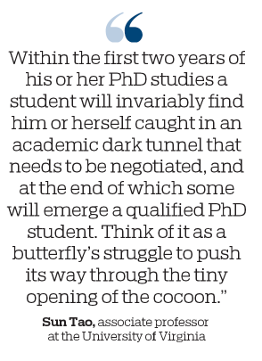 "Within the first two years of his or her PhD studies a student will invariably find him or herself caught in an academic dark tunnel that needs to be negotiated, and at the end of which some will emerge a qualified PhD student. Think of it as a butterfly's struggle to push its way through the tiny opening of the cocoon."
