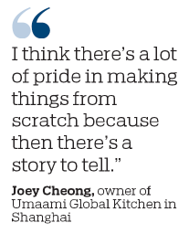 Another self-taught Singaporean chef who shares the same attention to detail as Mok is Joey Cheong, the owner of Umaami Global Kitchen in Shanghai's Jing'an district. Cheong once spent an hour observing a hawker in Singapore cook Hokkien mee-noodles fried in a prawn broth and topped with prawns and squid. He even used his mobile phone to time how long each of the different elements in the dish spent in the wok.