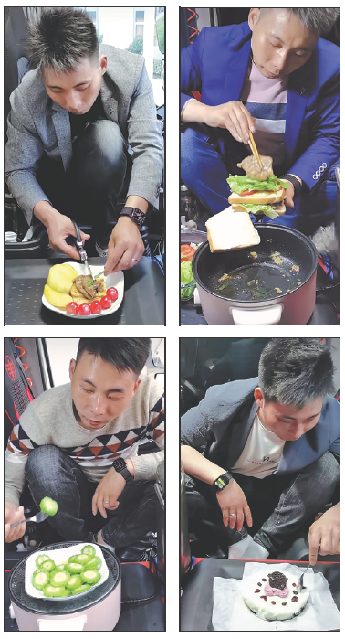 In a video this month, Shi tries fried fish in his cab. Using a pair of scissors to cut and gut the fish, he marinates it and then puts it in a pan with onions. Then he adds garlic, and red pepper flakes in oil.