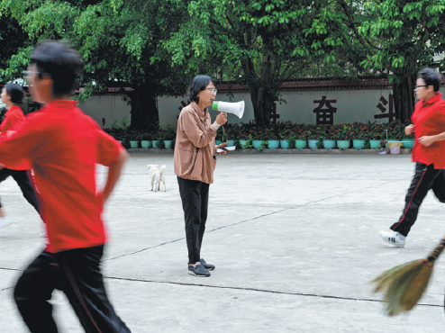 Zhang is not only the principal, but also the school's security guard and caretaker. While she ushers the students into class with her bullhorn, she also assumes the duties of checking the safety of water and electricity supplies.