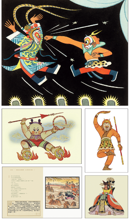 Moreover, Zhang's characters act vividly, showing the impact of posture, movement, costume and atmosphere derived from Peking Opera. The settings in the cartoon, such as the palace, lake, peach garden in heaven and the famous Huaguo Mountain and Shuilian Cave belonging to the monkeys, were inspired by Buddhist and Taoist architecture.