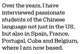 Over the years, I have interviewed passionate students of the Chinese language not just in the US, but also in Spain, France, Portugal, Cuba and Belgium, where I am now based. I feel delighted when young people greet me with nihao (Chinese for hello) in a Carrefour supermarket or the park near my apartment in Brussels.