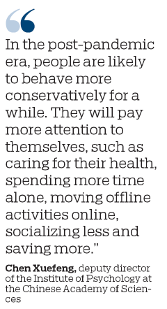Chen Xuefeng, deputy director of the Institute of Psychology at the Chinese Academy of Sciences, said: "In the post-pandemic era, people are likely to behave more conservatively for a while. They will pay more attention to themselves, such as caring for their health, spending more time alone, moving offline activities online, socializing less and saving more."