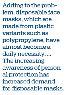 Adding to the problem, disposable face masks, which are made from plastic variants such as polypropylene, have almost become a daily necessity in Hong Kong and many other places. The increasing awareness of personal protection has increased demand for disposable masks.