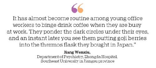 "It has almost become routine among young office workers to binge drink coffee when they are busy at work," Jiang says. "They ponder the dark circles under their eyes, and an instant later you see them putting goji berries into the thermos flask they bought in Japan."