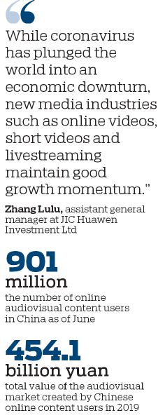 "While coronavirus has plunged the world into an economic downturn, new media industries such as online videos, short videos and livestreaming maintain good growth momentum," said Zhang Lulu, assistant general manager at JIC Huawen Investment Ltd.