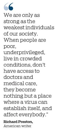 As a result, he believes it is necessary to pay attention to the conditions of poor people. "We are only as strong as the weakest individuals of our society. When people are poor, underprivileged, live in crowded conditions, don't have access to doctors and medical care, they become nothing but a place where a virus can establish itself, and affect everybody," he says.