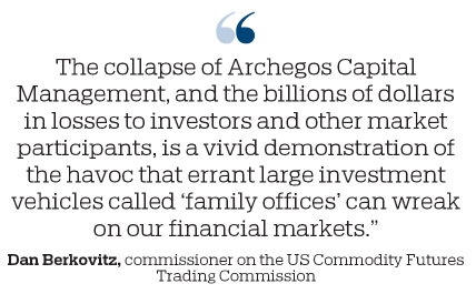Dan Berkovitz, a commissioner on the US Commodity Futures Trading Commission, said in a statement on April 1, "The collapse of Archegos Capital Management, and the billions of dollars in losses to investors and other market participants, is a vivid demonstration of the havoc that errant large investment vehicles called 'family offices' can wreak on our financial markets.