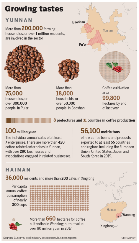 China's coffee market stood at an estimated 100 billion yuan ($15.6 billion) in 2019, according to the global research company Mintel. The coffee-producing area in Yunnan, China's largest producer of the bean, has grown steadily over the past decade to cover 99,800 hectares by the end of last year. More than 200,000 households, or over 1 million residents across at least eight prefectures and 31 counties, are involved in the industry, according to the local industry association.