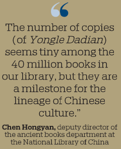 Chen Hongyan, deputy director of the ancient books department at the library, said the institution now has 224 copies of Yongle Dadian, including 62 temporarily stored at the National Palace Museum in Taipei.