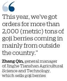 "This year, we've got orders for more than 2,000 (metric) tons of goji berries coming in mainly from outside the country," said Zhang Qin, general manager of Jinghe Tianshan Agriculture Science and Technology Co in Jinghe county, which cultivates, packs, processes and sells the fruit.