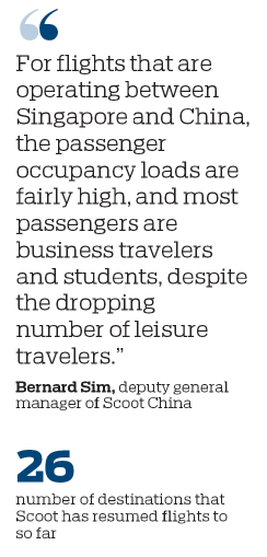 "For flights that are operating between Singapore and China, the passenger occupancy loads are fairly high, and most passengers are business travelers and students, despite the dropping number of leisure travelers. We hope to resume more flights between the two countries, and it depends on the decision of regulators," said Bernard Sim, deputy general manager for Scoot China.