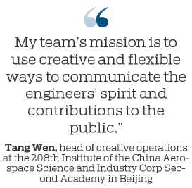 "Many accomplishments by Chinese space engineers can't be publicized because of their classified nature. My team's mission is to use creative and flexible ways to communicate the engineers' spirit and contributions to the public," she said.