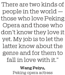 "There are two kinds of people in the world-those who love Peking Opera and those who don't know they love it yet," she said. "My job is to let the latter know about the genre and for them to fall in love with it."