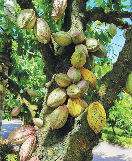 In Xinglong Tropical Botanical Garden, the attractive fruit, or pods, growing on the trunks and branches of the leafy trees-instead of only on the branches as with most other fruit trees-attract crowds of photo-snapping tourists. The pods contain seeds which are the cocoa beans. The DIY chocolate center also lures many to enjoy making chocolate themselves with cocoa beans harvested from the garden.
