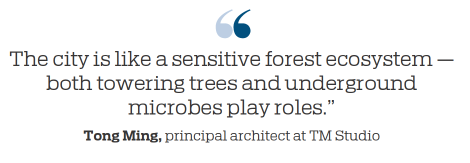 "The city is like a sensitive forest ecosystem-both towering trees and underground microbes play roles, but it is the small units such as retail outlets and cultural facilities that contribute to the diversity and inclusiveness," says Tong Ming, principal architect at TM Studio, a Shanghai-based architectural office.