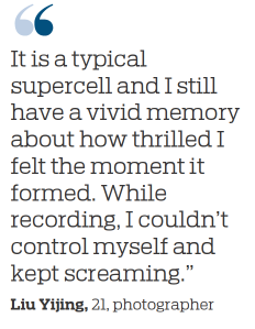 Liu has received a great deal of recognition for his work. His photos captured a complete supercell structure that occurred in the Inner Mongolia autonomous region on Aug 22. The image has been picked as the cover photo for the May edition of Advances in Atmospheric Sciences, a key publication in its field.