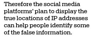 The move to display true locations of IP addresses can, at least, help other people identify where the posts are truly from, while preventing some netizens from portraying themselves as insiders to grab more eyeballs or get more hits.