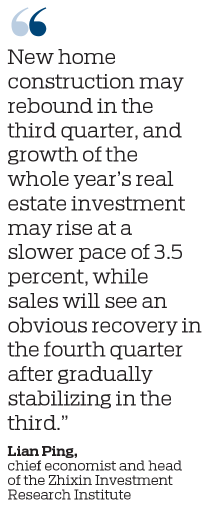 "New home construction may rebound in the third quarter, and growth of the whole year's real estate investment may rise at a slower pace of 3.5 percent, while sales will see an obvious recovery in the fourth quarter after gradually stabilizing in the third," Lian said.