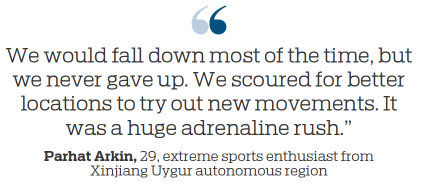 During his senior middle school years, Parhat began using a camera to record their parkour practice and soon got to know many other extreme sport buffs in Aksu.