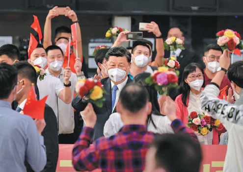 President Xi Jinping reaffirmed the significance of "one country, two systems" in ensuring the long-term prosperity and stability of the Hong Kong Special Administrative Region and the well-being of its residents as he embarked on a two-day trip to the SAR on Thursday.