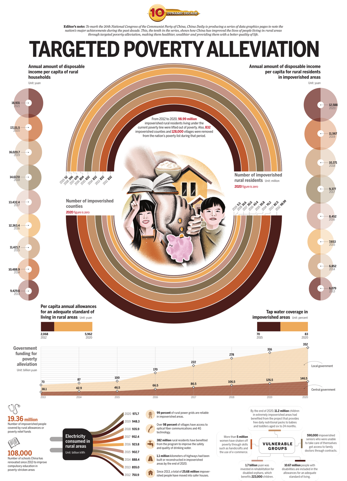 Editor's note: To mark the 20th National Congress of the Communist Party of China, China Daily is producing a series of data graphics pages to note the nation's major achievements during the past decade. This, the tenth in the series, shows how China has improved the lives of people living in rural areas through targeted poverty alleviation, making them healthier, wealthier and providing them with a better quality of life.