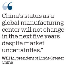 "China's status as a global manufacturing center will not change in the next five years despite market uncertainties," Li said. "The establishment of a manufacturing center needs support from supply chains ranging from raw materials to end market. Some businesses along the industrial chain might leave the Chinese market but it is difficult to move the entire chain out of China."
