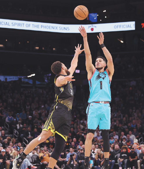 PHOENIX — Devin Booker stepped back for a 3-pointer in the closing minute of the third quarter as Golden State's Stephen Curry gamely tried to stay with him, putting a hand in his face. Booker made the shot anyway as a frustrated Curry dropped his head.