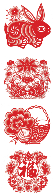 Paper-cut patterns include bucolic scenery, references to ancient tales, flowers or fruit, animal or human figures, and the Chinese characters for happiness or luck. They generally have auspicious meanings, expressing gratitude for a good life or hope for the future in an aesthetic way.