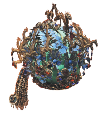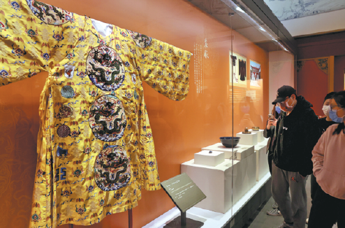 The emperor's crown, which was knotted with more than 500 gold threads, is among the highlights of the exhibition. Each thread is no wider than 0.2 millimeters, and the crown weighs about 800 grams. A pair of dragons are entrenched on both wings of the crown, and some 8,000 gold "dragon scales" are used to decorate the crown, showcasing advanced techniques back then.