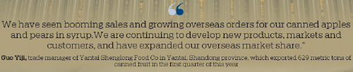 Early last month, 18 tons of canned apples were shipped to Japan from Yantai, Shandong. The cans were produced by Yantai Shenglong Food Co. In the first quarter, the company exported 629 tons of canned fruit, more than double the volume compared with the same period last year.