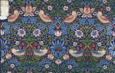 For example, there's an original Morris watercolor design for his Acanthus wallpaper, which is shown alongside the final printed product. Acanthus design and the Strawberry Thief textile pattern, which shows birds stealing strawberries, are among exhibits that demonstrate Morris' strength in using plants, flowers, birds and animals as inspiration.