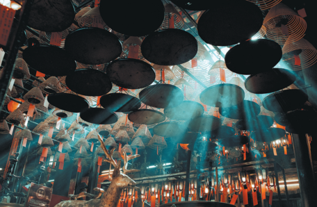 Despite being situated in one of the busiest areas of Hong Kong, when you step through the threshold into the temple, it is a remarkably peaceful experience, with its patrons, and sparse number of tourists silently making their offerings and taking in the building's unique appearance, with the peace only broken by the occasional striking of a gong.