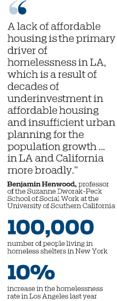 Benjamin Henwood, a professor of the Suzanne Dworak-Peck School of Social Work at the University of Southern California, told China Daily, "A lack of affordable housing is the primary driver of homelessness in LA, which is a result of decades of underinvestment in affordable housing and insufficient urban planning for the population growth experienced in LA and California more broadly."