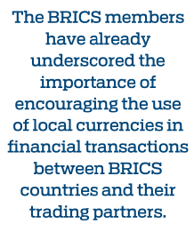 The BRICS members have already underscored the importance of encouraging the use of local currencies in financial transactions between BRICS countries and their trading partners. A common payment card system may complement (but not replace) existing national payment card systems. Connections may be established between Chinese, Indian and Russian financial messaging systems to operate alongside the Western controlled SWIFT system. And the BRICS in conjunction with the EAEU has started to explore the possibility of creating a parallel regional and possibly global reserve currency based on a basket of commodities and BRICS currencies. If established, it will permit the issuing of bonds to finance development projects.