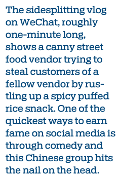 The sidesplitting vlog on WeChat, roughly one-minute long, shows a canny street food vendor trying to steal customers of a fellow vendor by rustling up a spicy puffed rice snack. One of the quickest ways to earn fame on social media is through comedy, and this Chinese group hits the nail on the head. The song's wordplay on "Jimmy" to exploit multiple meanings including jie mi (give rice) is pure genius. The trope of cross-dressing also works if one is prone to believe that a man in a woman's dress is funny because he mocks the norms imposed on gender-fluid individuals.
