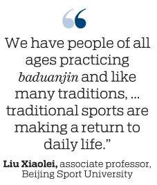 "We have people of all ages practicing baduanjin and like many traditions, such as hanfu (historic Chinese attire), traditional sports are making a return to daily life," she says.