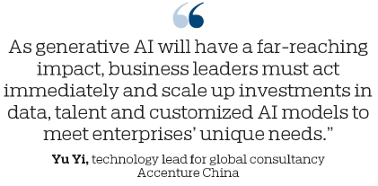 Yu Yi, technology lead for global consultancy Accenture China, said, "As generative AI will have a far-reaching impact, business leaders must act immediately and scale up investments in data, talent and customized AI models to meet enterprises' unique needs."