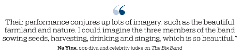"Their performance conjures up lots of imagery, such as the beautiful farmland and nature. I could imagine the three members of the band sowing seeds, harvesting, drinking and singing, which is so beautiful," said pop diva Na Ying, one of the six celebrity judges on the reality show.