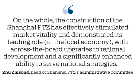 "On the whole, the construction of the Shanghai FTZ has effectively stimulated market vitality and demonstrated its leading role (in the local economy), with across-the-board upgrades to regional development and a significantly enhanced ability to serve national strategies," Zhu Zhisong, head of Shanghai FTZ's administrative committee, said at a news conference on Sept 15.