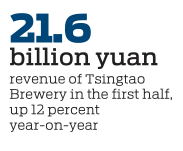 In the first six months, the company achieved revenue of 21.6 billion yuan ($2.96 billion), up 12 percent year-on-year, selling 5.02 million kiloliters of beer, up 6.5 percent.