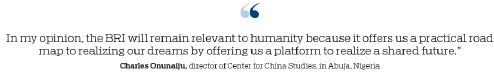 "In my opinion, the BRI will remain relevant to humanity because it offers us a practical road map to realizing our dreams by offering us a platform to realize a shared future. So as far as humanity moves along the line of collective aspiration, concern for collective security and enduring peace, and sustainable development, the BRI will remain relevant in the drive to accomplish these goals."
