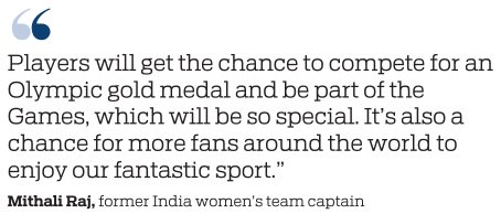 "Players will get the chance to compete for an Olympic gold medal and be part of the Games, which will be so special," said Mithali Raj, a former India women's team captain. "It's also a chance for more fans around the world to enjoy our fantastic sport."