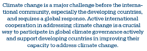 Climate change is a major challenge before the international community, especially the developing countries, and requires a global response. Active international cooperation in addressing climate change is a crucial way to participate in global climate governance actively and support developing countries in improving their capacity to address climate change. At the same time, international cooperation can further help the BRI countries to grow and help local communities to improve people's lives in an environmentally friendly way.