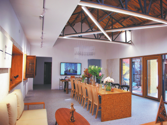 The skylight on the roof of the central lounge provides interior lighting and ventilation, as well as thermal storage in addition to that provided by the thickened exterior walls and passive windows, which also help retain heat. These features enable a standard temperature of 20 C to be maintained at the house in winter, rising to 26 C in summer.